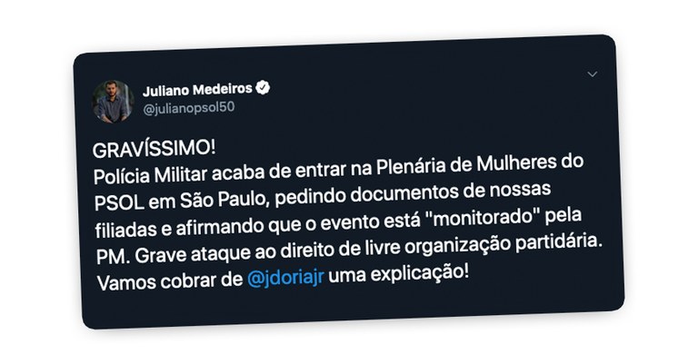 Juliano Medeiros, presidente nacional do partido, chamou o incidente de "grave ataque ao direito de livre organização". E completou: "não há qualquer justificativa para que a PM 'monitore' um evento partidário".⠀