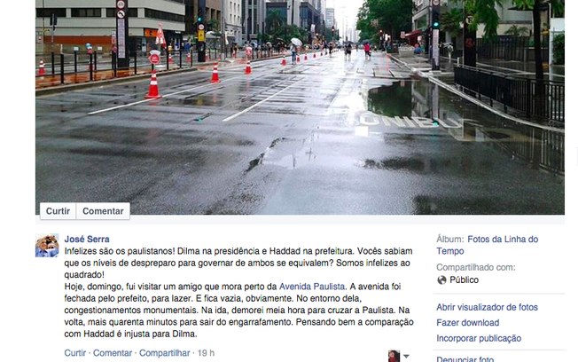 No entanto, Serra foi altamente criticado por rechaçar o fechamento da Paulista e publicar uma imagem da via no domingo, dia em que a cidade chegou a entrar em estado de atenção por causa de temporais que provocaram alagamentos em alguns pontos da capital.