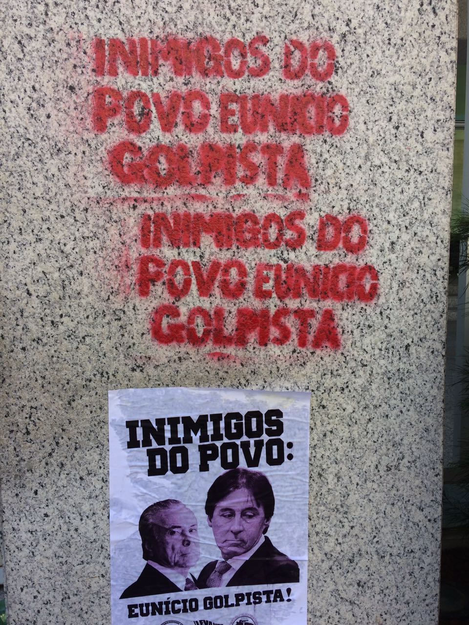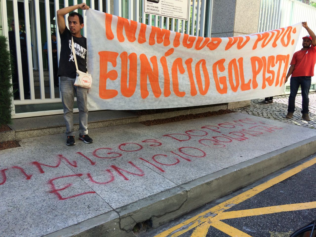A ação faz parte de uma jornada de lutas que acontece em todo Brasil, chamada pelos manifestantes de “escrachos aos golpistas”, que visa denunciar os parlamentares e senadores que colaboraram com o golpe que culminou no impeachment da presidenta democraticamente eleita, Dilma Rousseff.