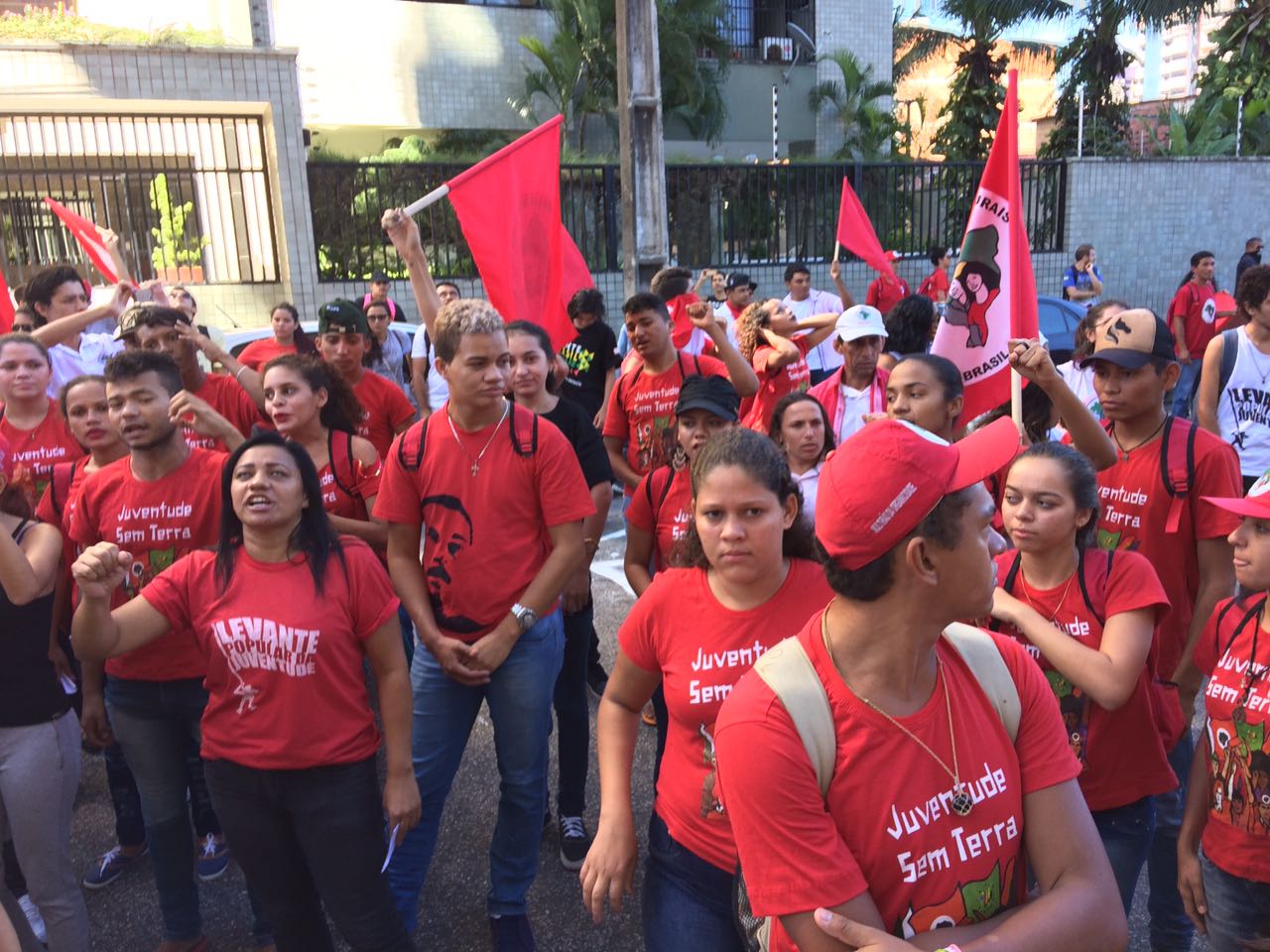 Na manhã desta quinta-feira (27), cerca de 200 jovens do Movimento dos Trabalhadores Rurais Sem-Terra, Levante Popular da Juventude e Movimento dos Atingidos por Barragens, realizaram um ato em frente a Mansão Macêdo, localizada no bairro Aldeota, residência do presidente do Senado Eunício Oliveira (PMDB/CE) na capital cearense.